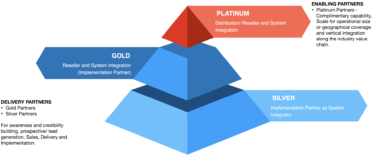 It comprises of two types of partners i.e., GOLD and Silver. They are responsible for the awareness and credibility building, prospective/ lead generation, Sales, and Delivery/ Implementation.
